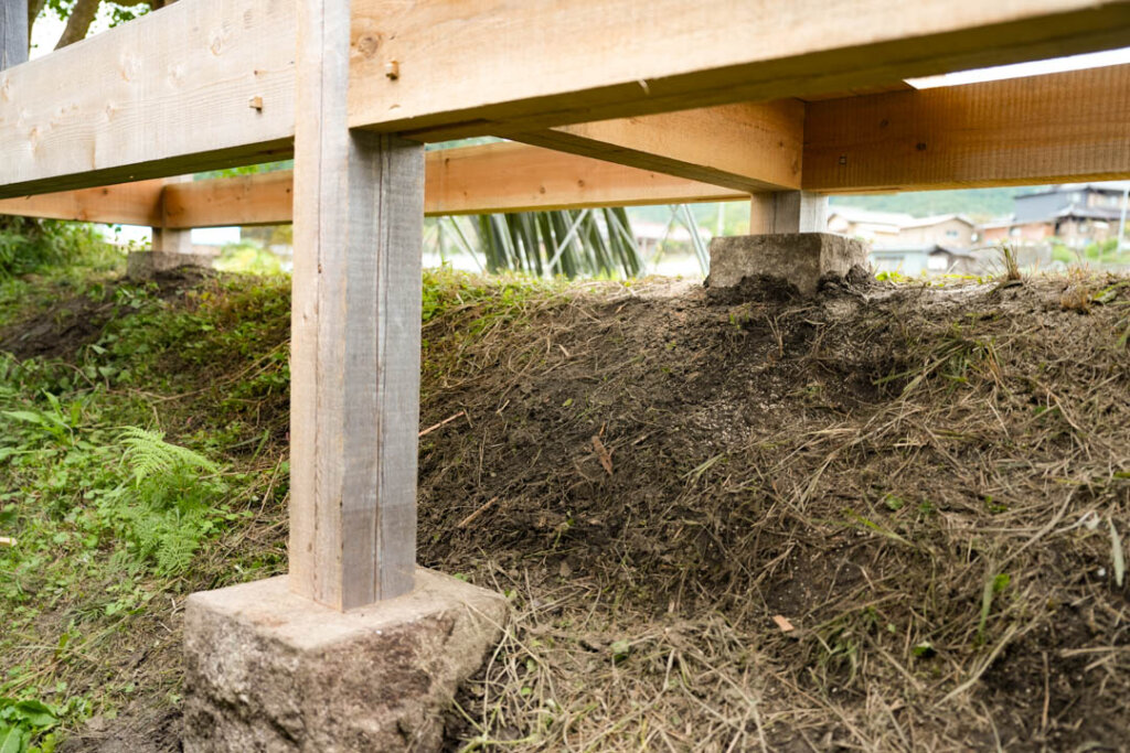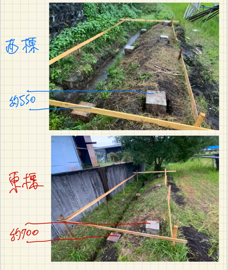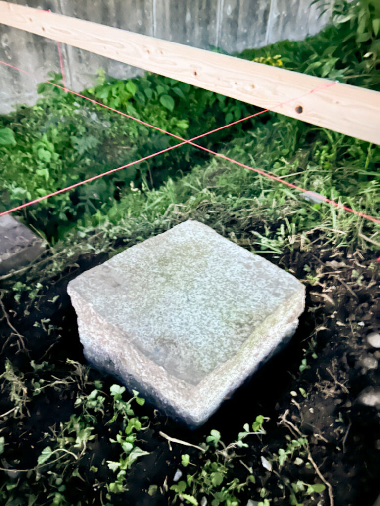 適当に丁張して、通りを出しました。礎石の下には、木杭を打って栗石を小端立ています。丁張から石据えまで、私とインターンの方の4人で1日で12個設置しました。