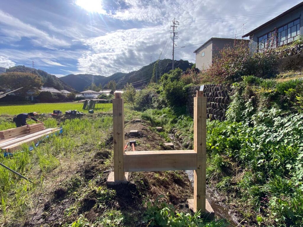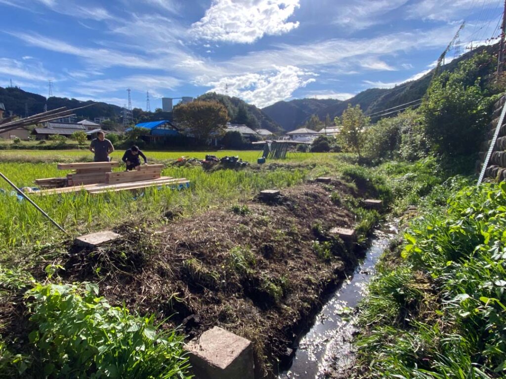 結果、基礎は背の高い300角の石を手に入れたのでいつも通りの石場建てにし、基礎の緊結はやり方がわからないので緊結しなくてもよいように高さを抑えて幅を三尺から四尺にして、位置は便利さを優先して畔を拡幅する事にしました。ちょっとやり直したい所もありますが、とりあえずは満足いく物が出来ました。
