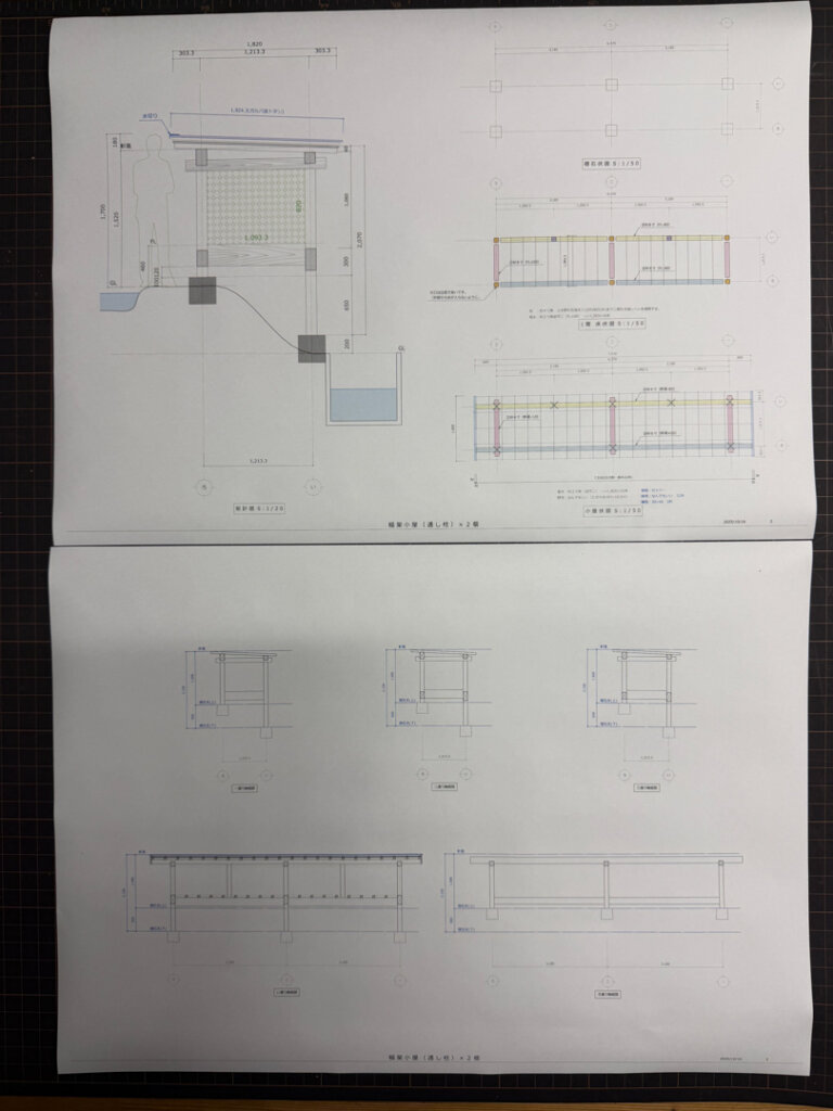 今回は斜面ということもあり基礎をどうするか、基礎と柱の緊結をどうするか、収納量を確保する為に建物の妻行の幅と高さをどうするか、畔の幅も余裕がないので畔の広い所に作るか便利な位置に作るか、出来るだけ長持ちして夏の草刈りのしやすさと稲架の出し入れのしやすさなど、いろいろ考えて描きました。