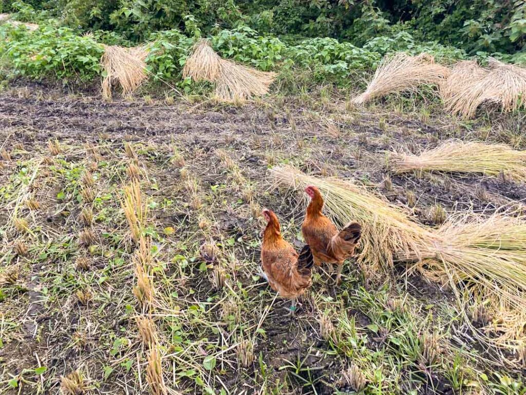 稲刈り中の鶏。鶏も稲刈りの匂いにつられて穂を食べにきます。