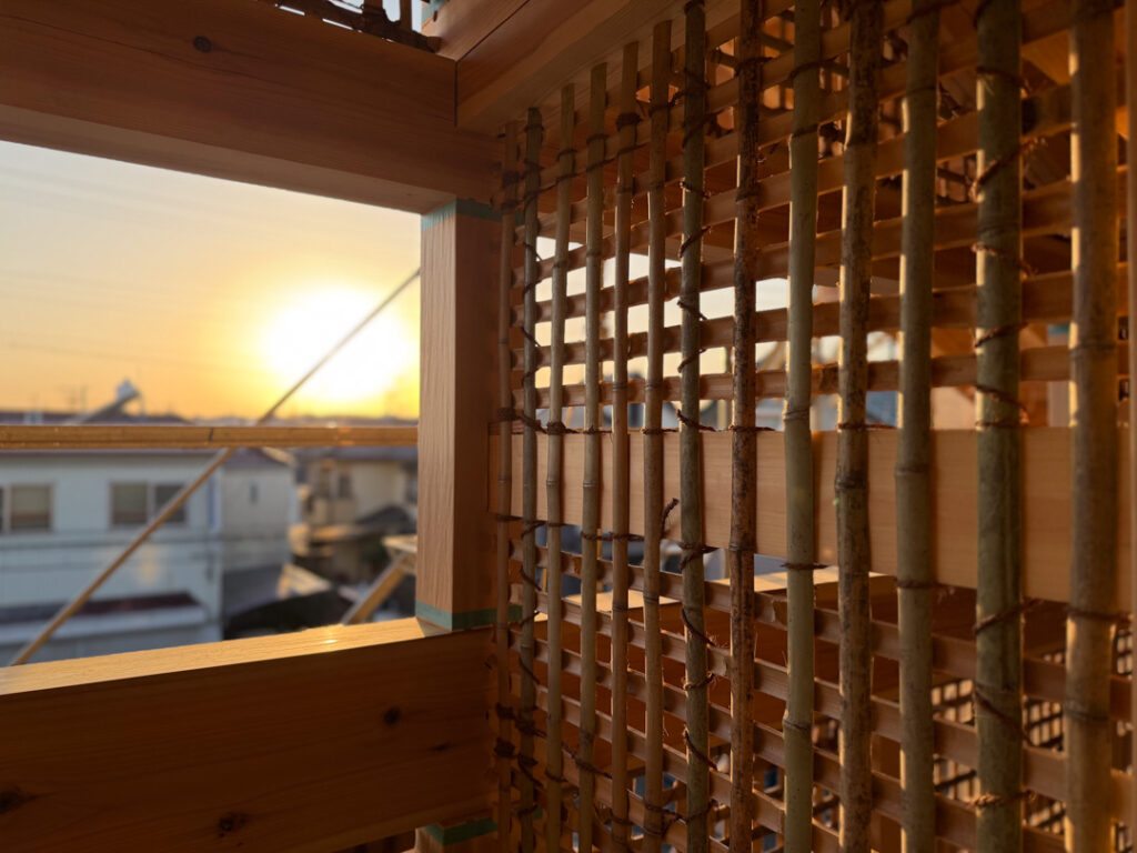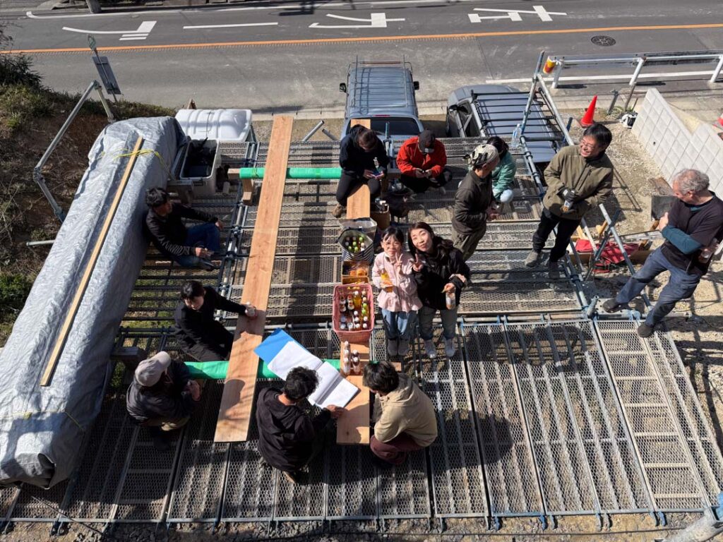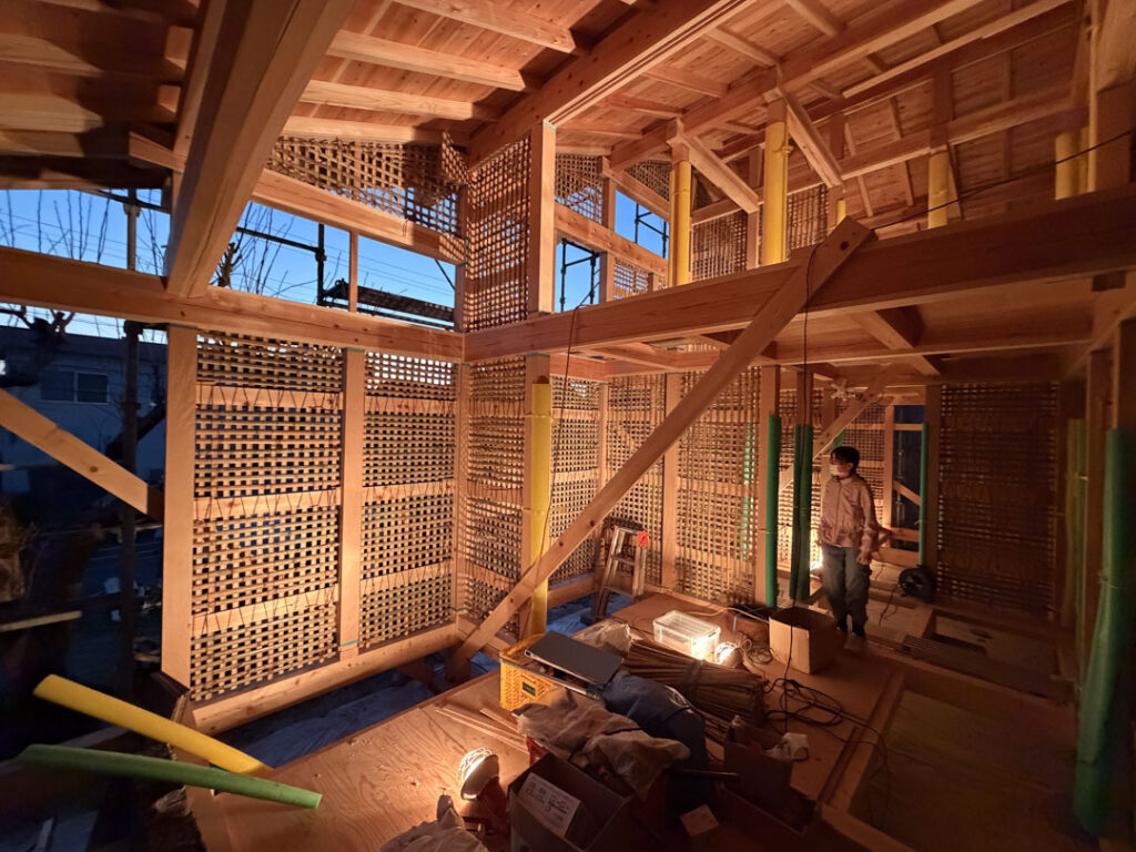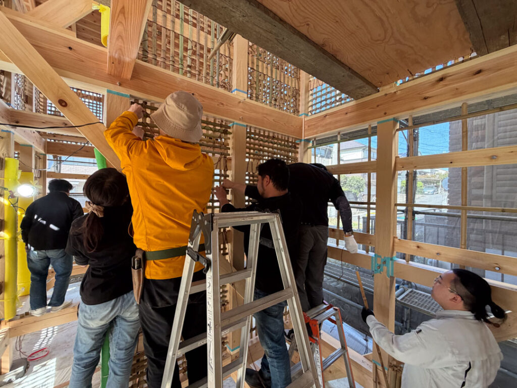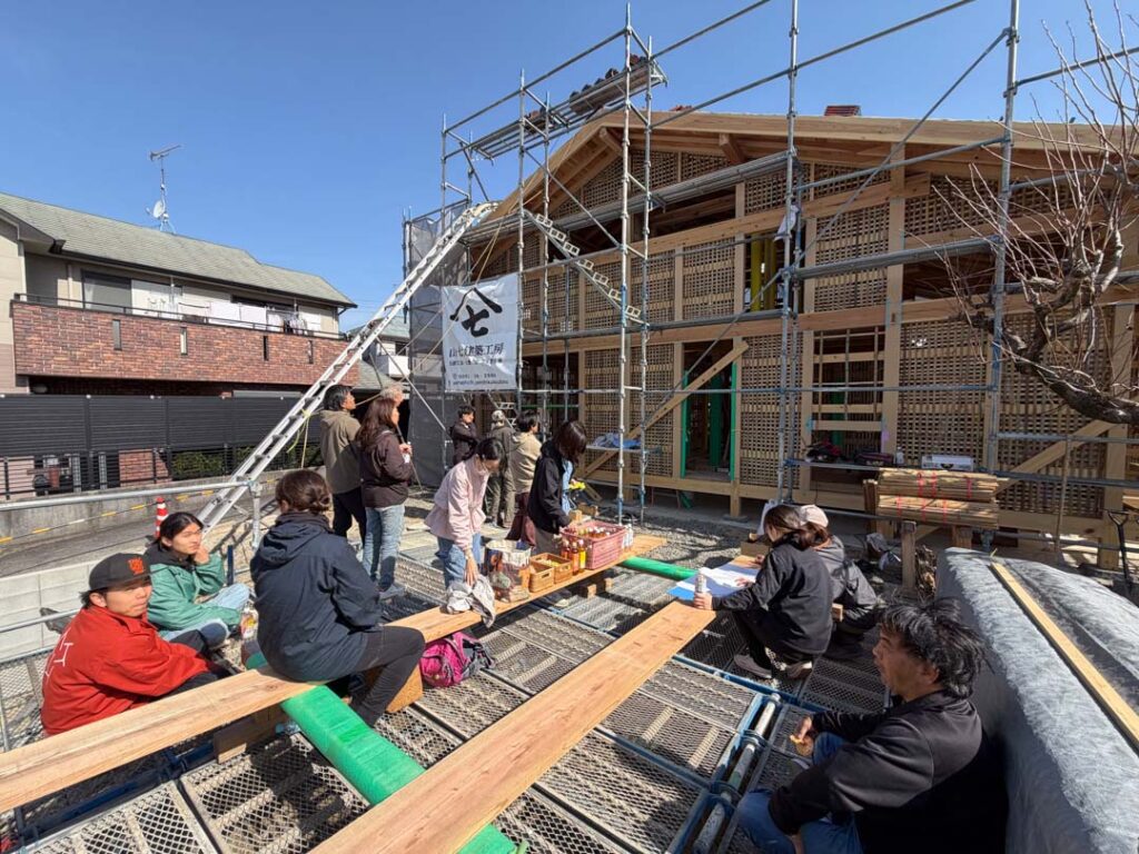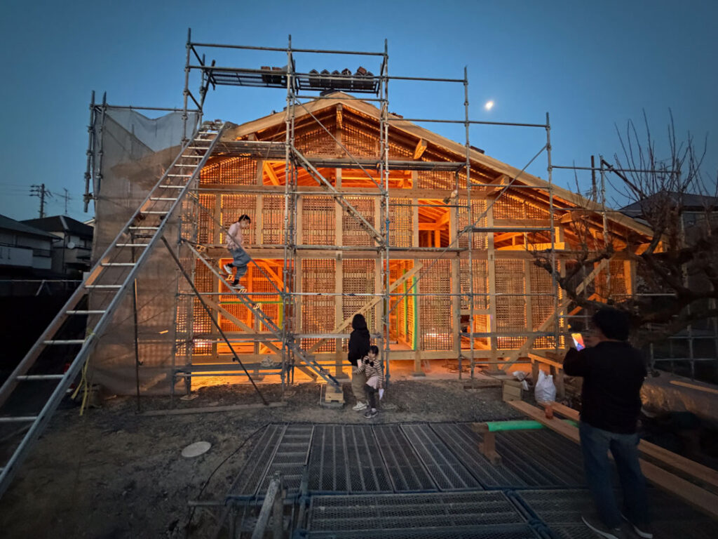 今回は、スタッフ合わせて約30名ほどの参加でした。佐藤さんの大工仲間やフィールド仲間やこれから家を作る建主さんたちが、竹小舞のお手伝いをしながら佐藤家を祝福しているようで、温かく美しい光景でした。