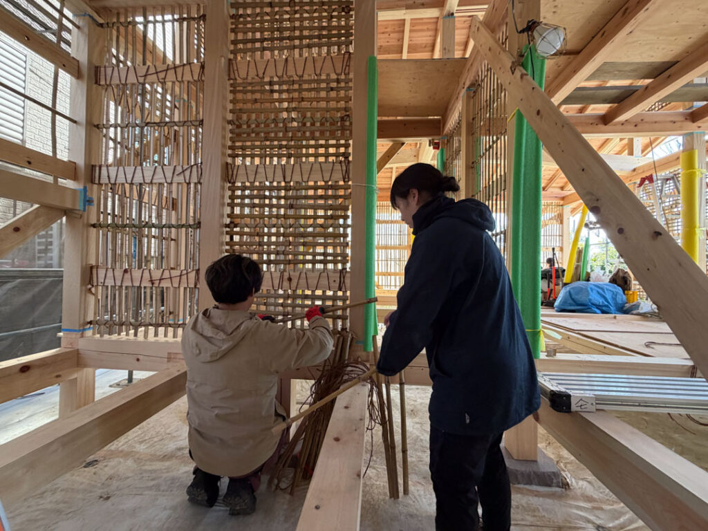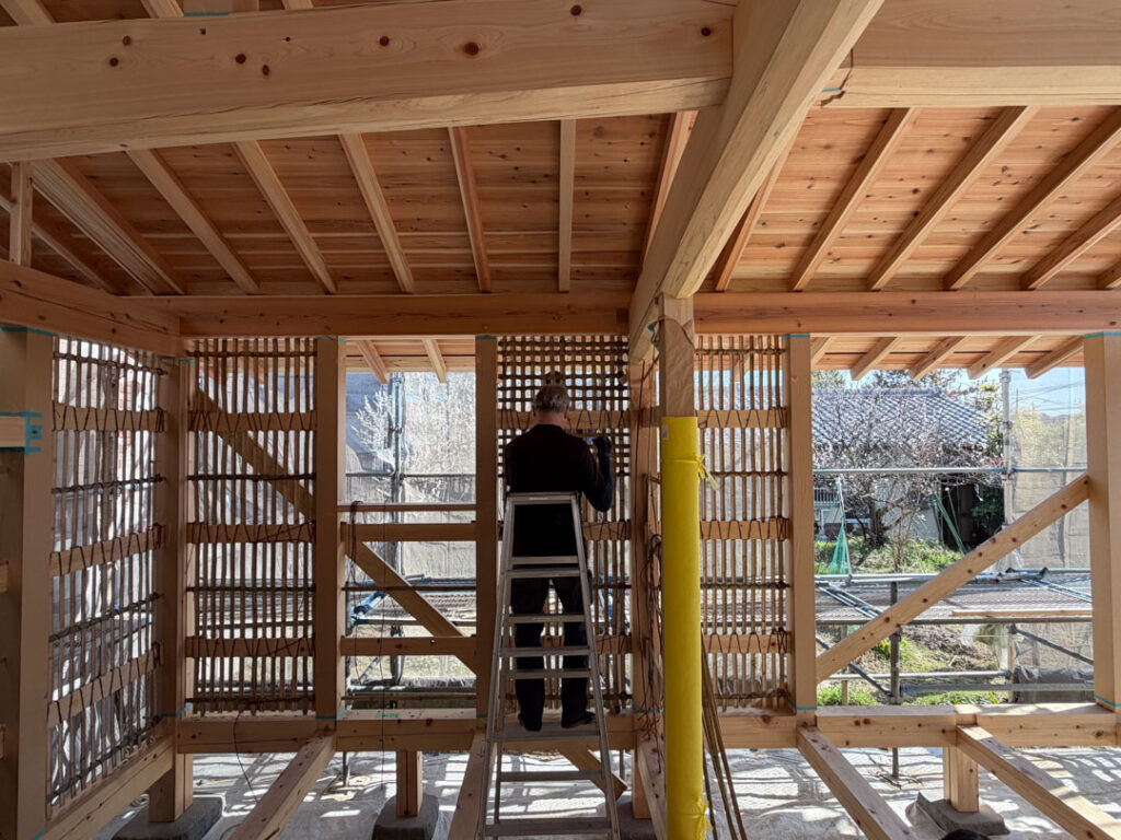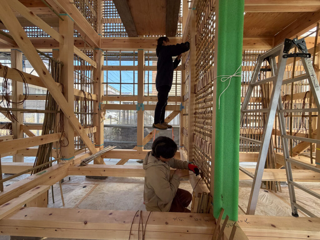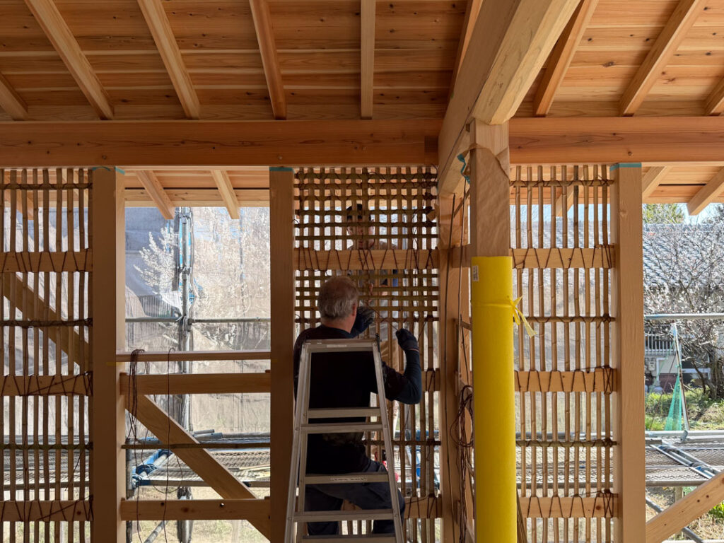 佐藤さんは、工作舎の中村さんの所で修業していた頃から竹を編んだり泥を塗ったりしてきたそうで、本人は久しぶりと言いながらも早くて上手。棟梁は大工仕事はもちろんですが、いろいろな職方の仕事を知ることも大事です。