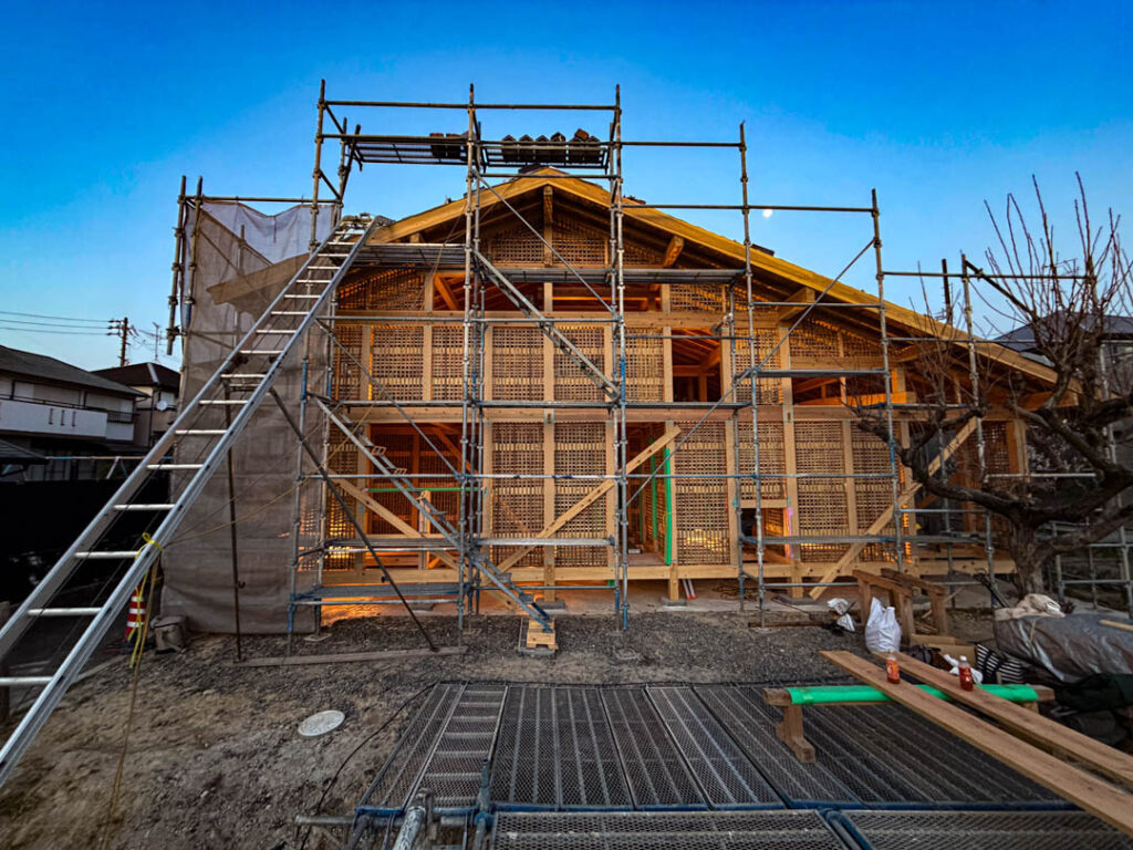 この家の建主は大工の佐藤さんで、基礎工事の石据えから竹小舞までご自身で進めています。もちろん、墨付け・刻みも。