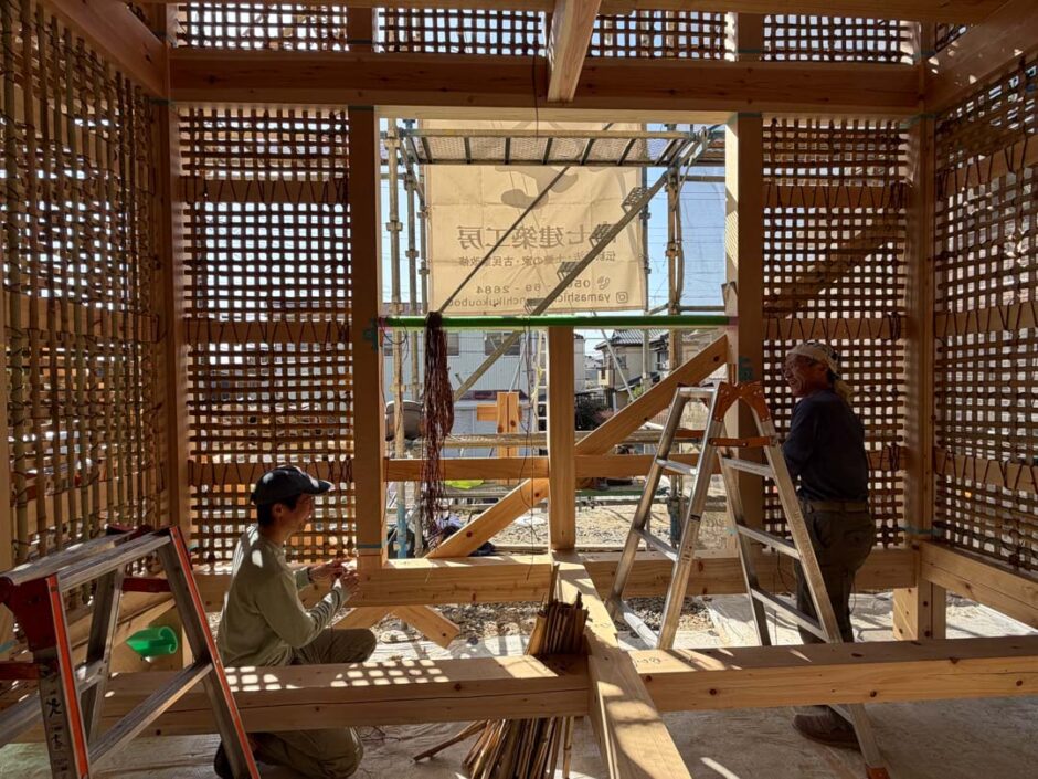 この家の建主は大工の佐藤さんで、基礎工事の石据えから竹小舞までご自身で進めています。もちろん、墨付け・刻みも。