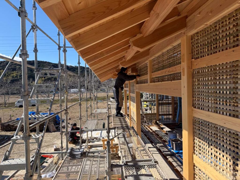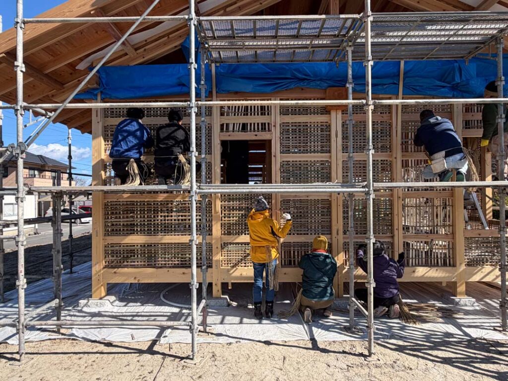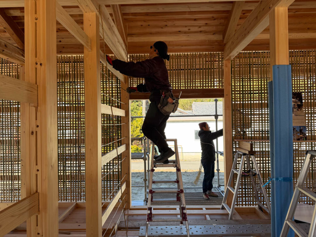 お施主さんはじめ、すでに家つくりを終えた方からこれから家つくりを始める方まで、木ごころ工房ファンの皆さんが大勢いらっしゃいました。最初、黙々と編んでいる方が多く誰が職人さんなんだろうと思っていたら、大半が結作業の皆さんだったんですよね。
