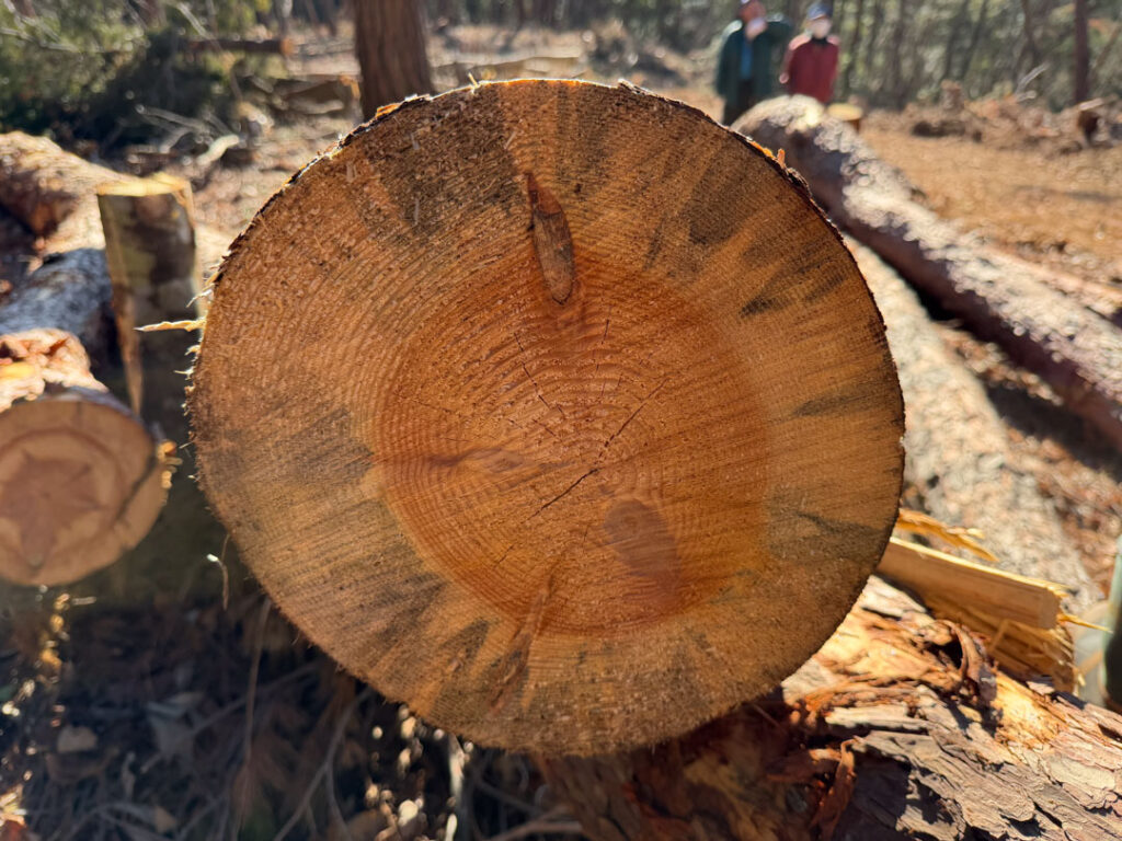 すでに死んでいるので、白太部分には青カビが入っています。もちろん建築の材木としては使えません。この木はバイオマスのチップ行きです。