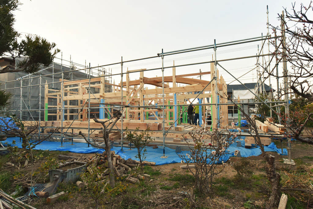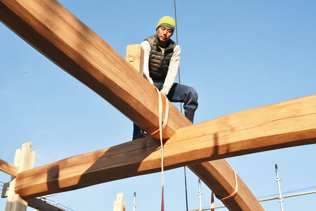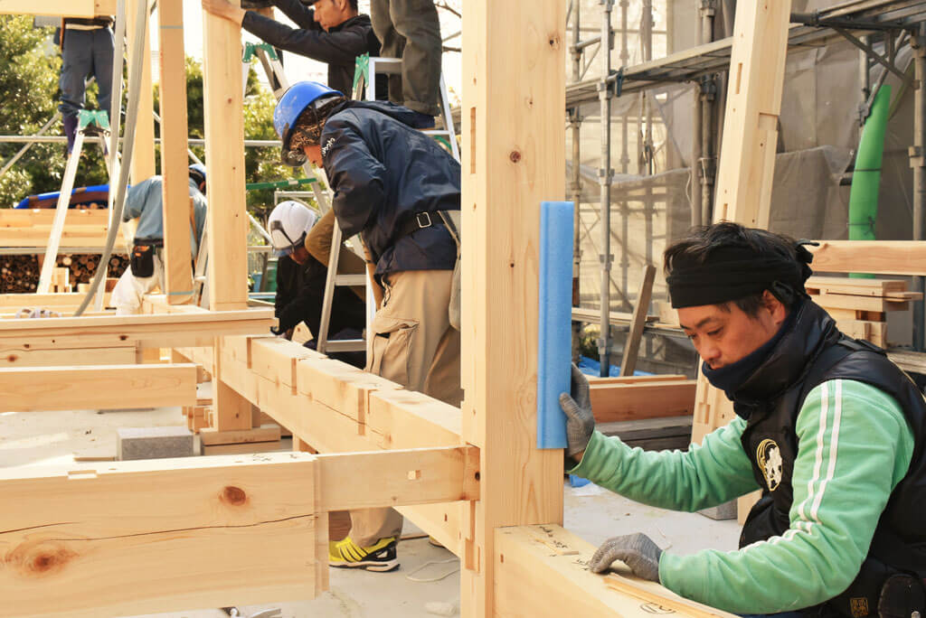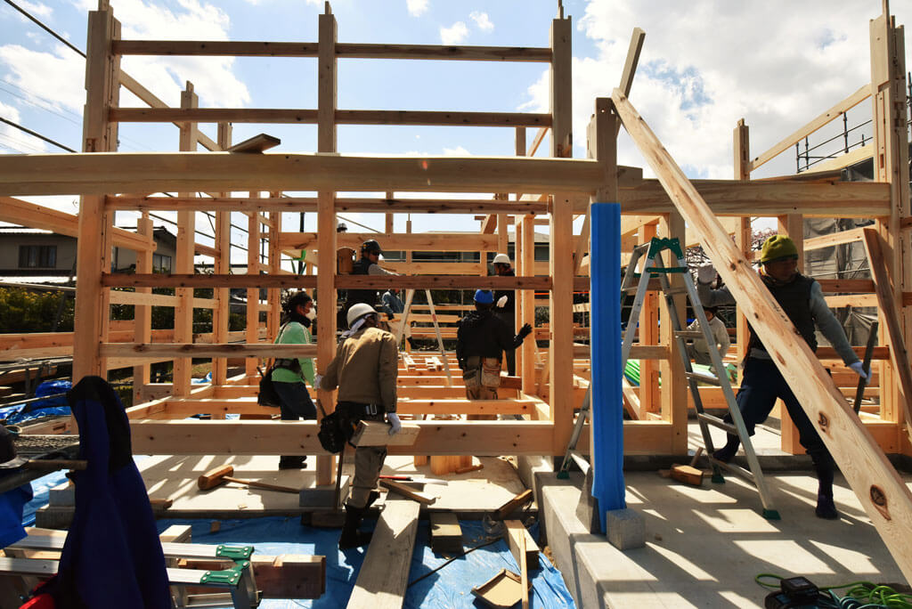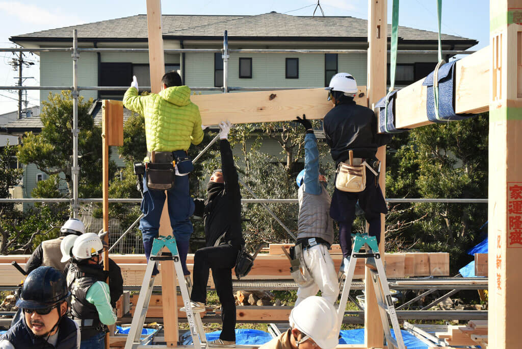 松村さんが活動されている静岡県西部では、手刻みに向き合う大工さんの集まり「木遊舎」 というグループがあります。今回の建て方も木遊舎の皆さんが応援に来て頂いたのですが、普段出会う事のない伝統工法に向き合っている同世代の大工さんが、十数名も集まり本当に驚きました。