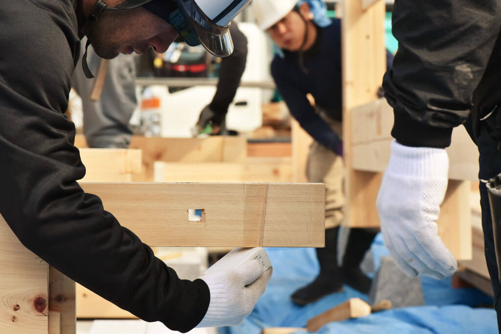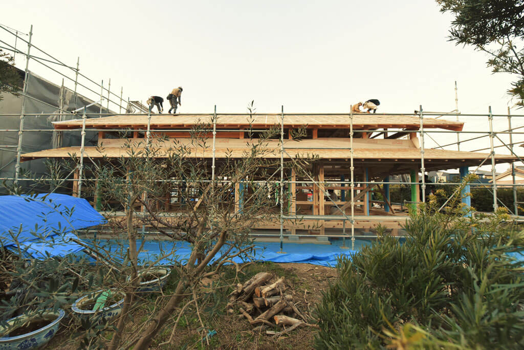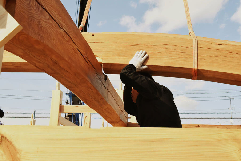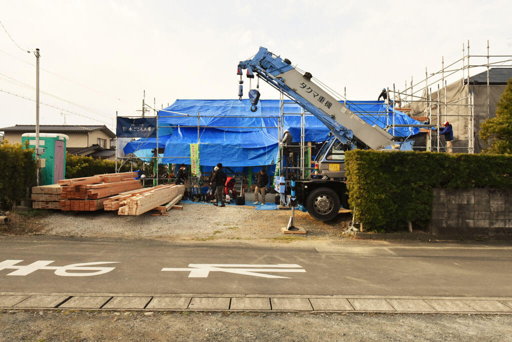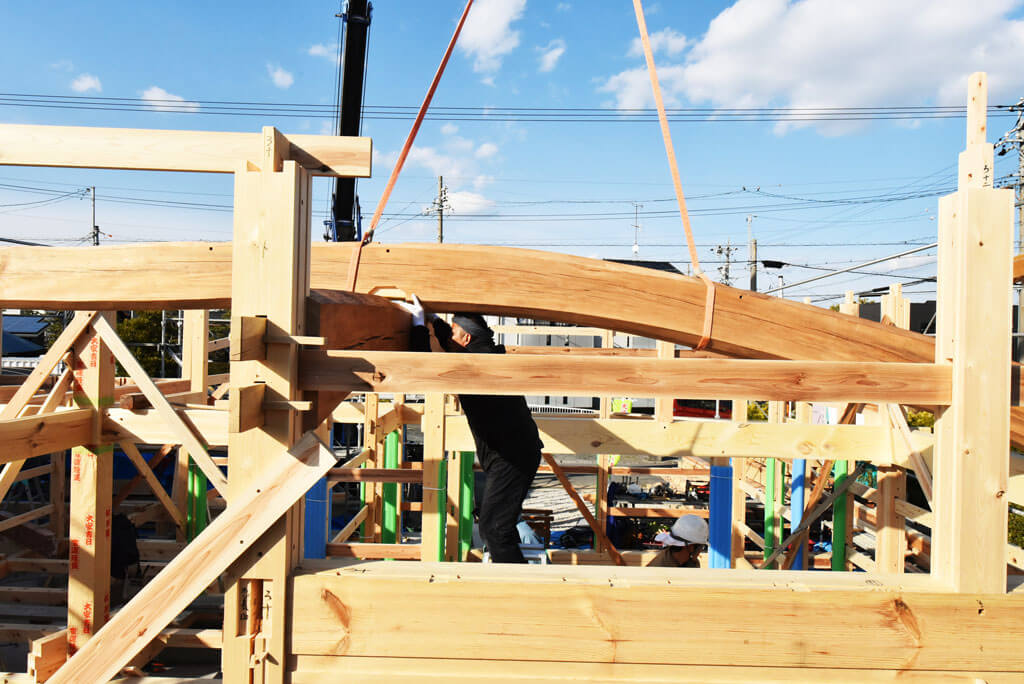 松村さんが活動されている静岡県西部では、手刻みに向き合う大工さんの集まり「木遊舎」 というグループがあります。今回の建て方も木遊舎の皆さんが応援に来て頂いたのですが、普段出会う事のない伝統工法に向き合っている同世代の大工さんが、十数名も集まり本当に驚きました。