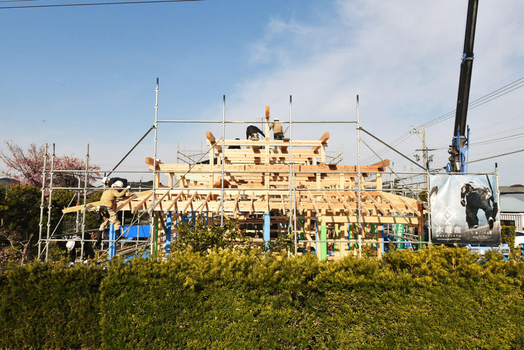 今回は天気にも恵まれ、桜舞い散る建方となりました。